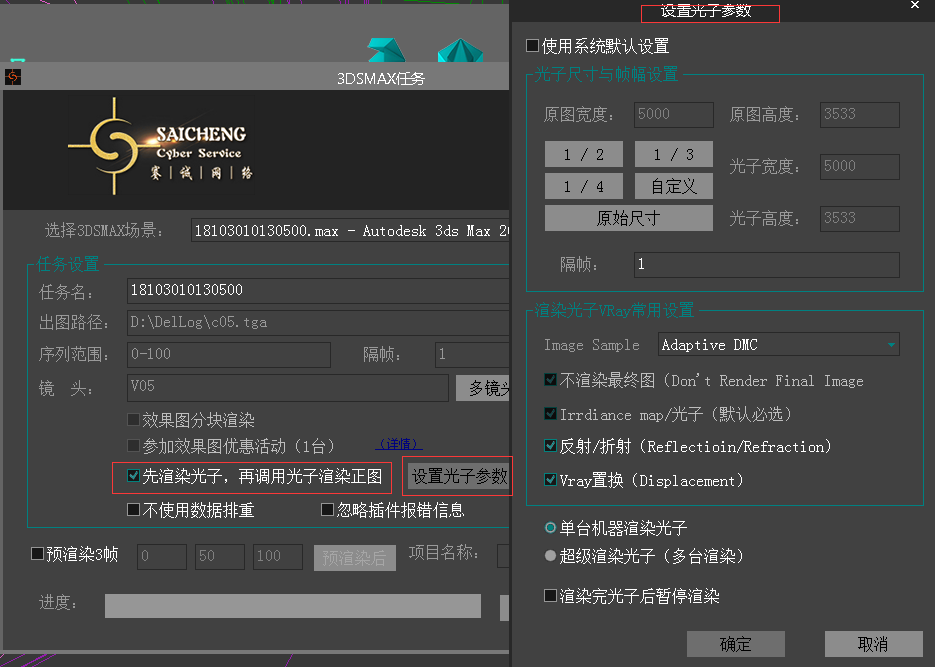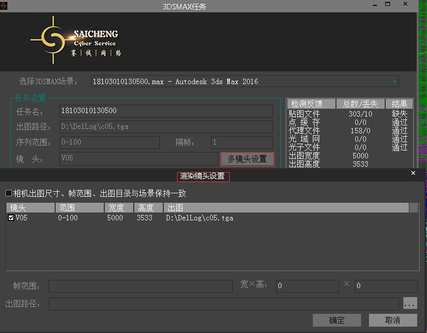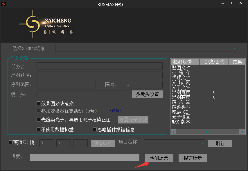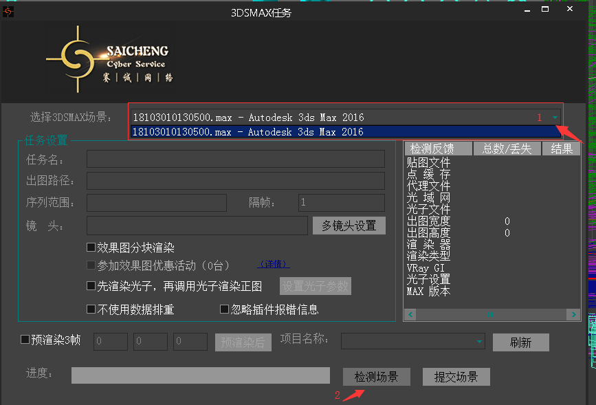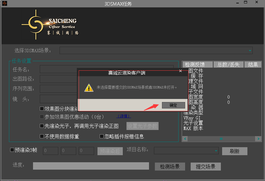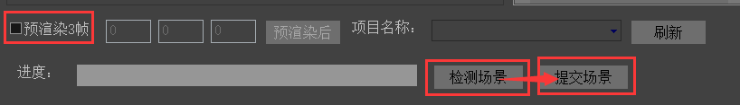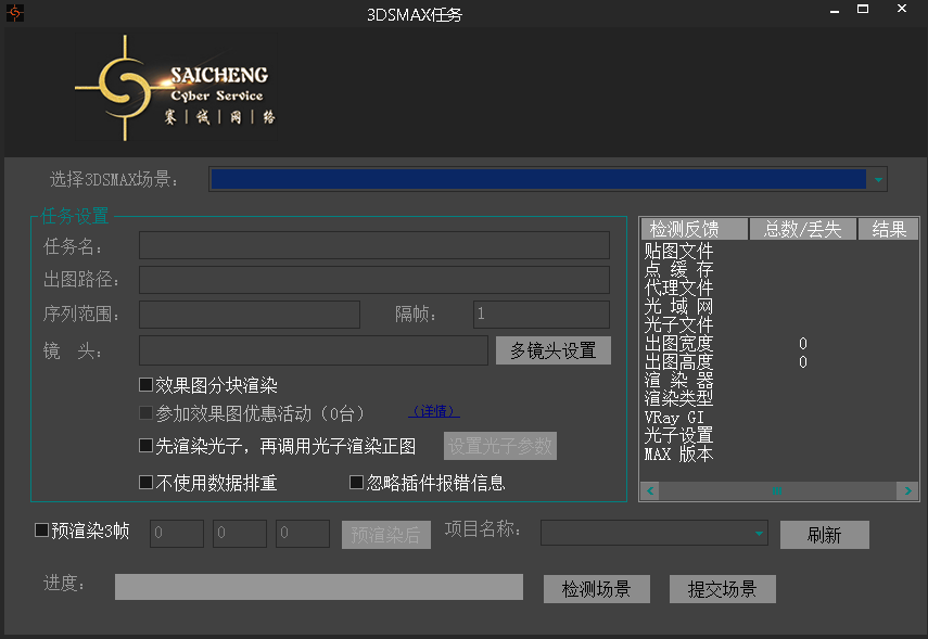 客戶端窗口就會顯示該場景大體參數,確認無誤后點擊提交任務,可使用預渲染三幀功能,方便確認測試出圖無誤。如圖: